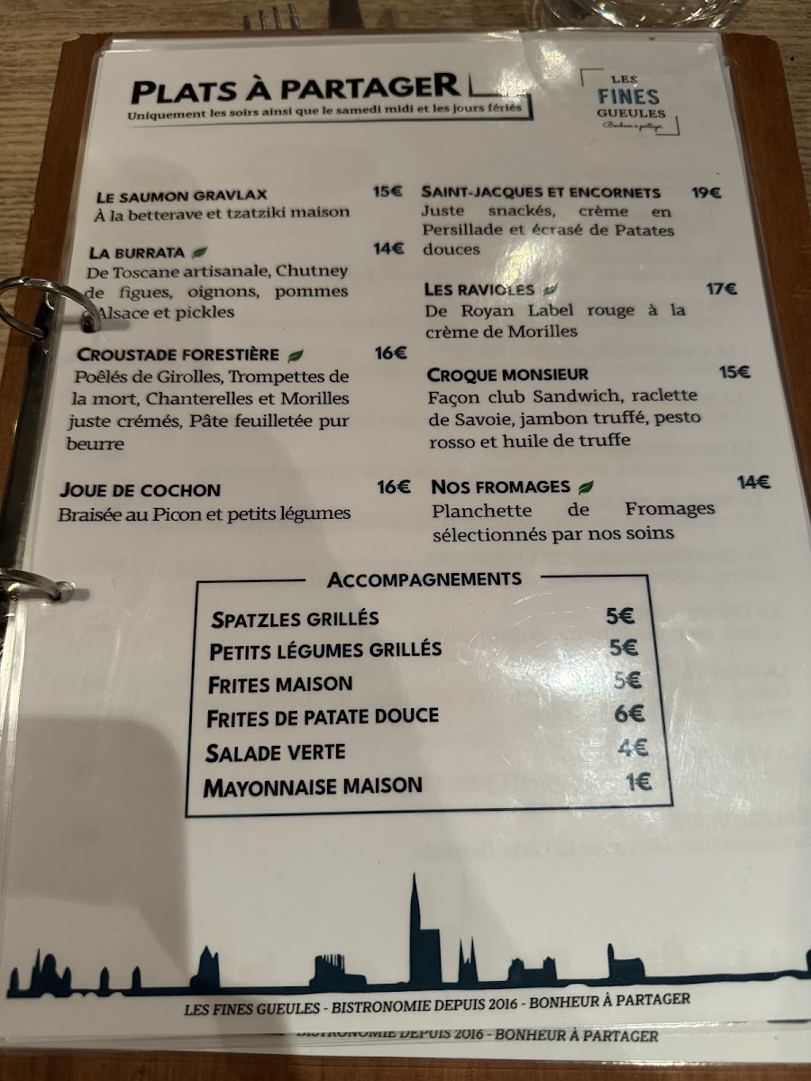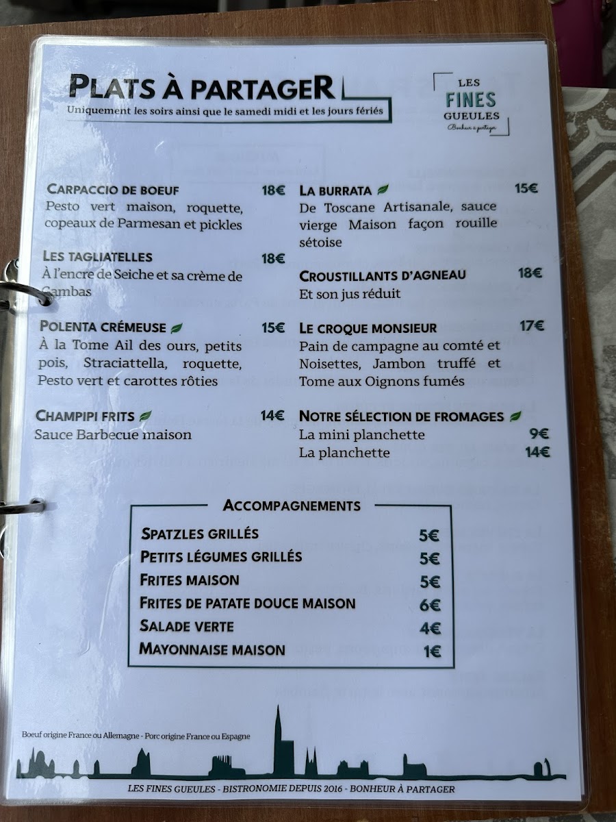 Welcome to Les Fines Gueules, a delightful culinary gem nestled in the heart of Strasbourg at 5 Rue Gustave Doré. This charming restaurant specializes in a unique fusion of French and Italian tapas, making it the perfect destination for those looking to experience innovative cuisine in a cozy, welcoming atmosphere.